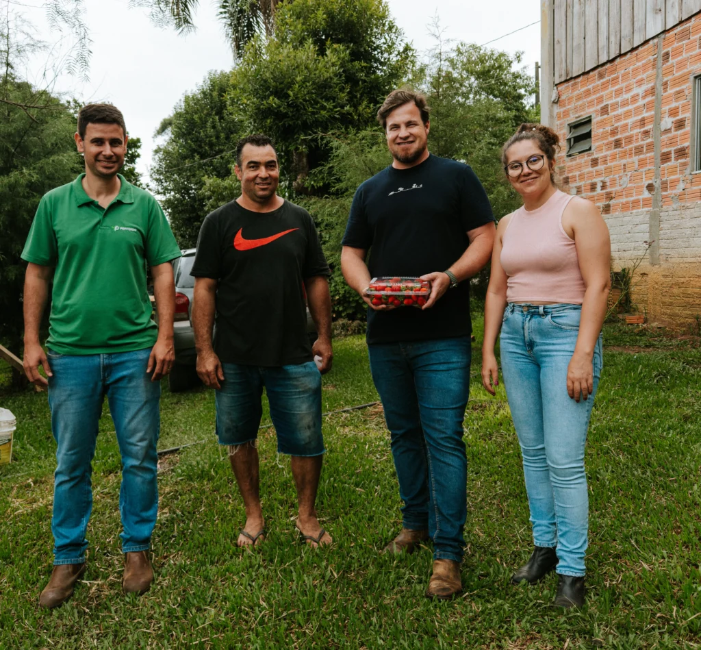 Durante a visita, também contamos com a presença de Jean, representante da Agro Penteado, empresa fornecedora de insumos e estrutura para a produção de morangos. Além disso, Jean é um dos representantes da Mecplant na região e reforçou a importância da parceria para ampliar a presença da Mecplant no mercado. Segundo ele, a empresa busca oferecer um produto de alta qualidade, com garantia, preço justo e produzido de forma ambientalmente correta.